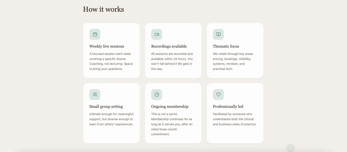 Each week, we come together to focus on what actually needs attention in your practice: pricing, boundaries, bookings, visibility, systems, and the mindset work that sits beneath it all.
